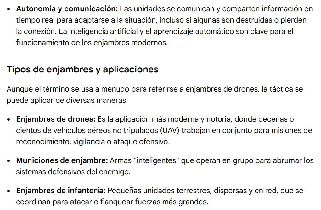 En SpaceMX, desarrollamos, probamos y vendemos exclusivamente la Unidad de Dron de Un Piloto (VTL-MX1). Los verdaderos (y grandes) estrategas mundiales del "SWARM" trabajan en el Pentágono, sin posibilidad de contratarlos. Sin embargo, en México, nuestra Secretaría de la Defensa ha desarrollado numerosas Tácticas Militares y Policiales de "SWARM" para combatir a los cientos de nuestros "narco-carteles". Así que, siéntete libre de visitarlos, como EXPERTO en tácticas militares de tu país.